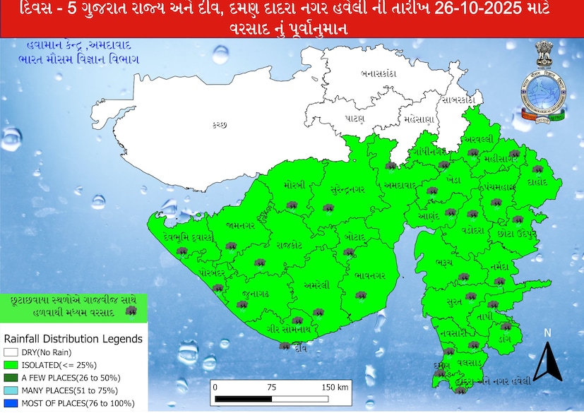 26 ઓક્ટોબરના રોજ અમદાવાદ સહિત ગાંધીનગર, અરવલ્લી, ખેડા, આણંદ, પંચમહાલ, દાહોદ, મહીસાગર, વડોદરા, છોટા ઉદેપુર, નર્મદા, ભરૂચ, સુરત, ડાંગ, તાપી, નવસારી, વલસાડ અને દમણ, દાદરા અને નગર હવેલી, સુરેન્દ્રનગર, રાજકોટ, જામનગર, પોરબંદર, જૂનાગઢ, અમરેલી, ભાવનગર, મોરબી, દ્વારકા, ગીર સોમનાથ, બોટાદ અને દીવમાં ગાજવીજ સાથે હળવાથી મધ્યમ વરસાદની સંભાવના છે.