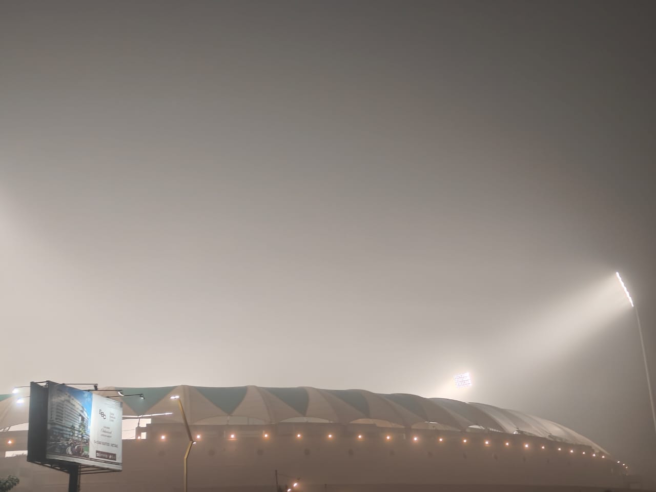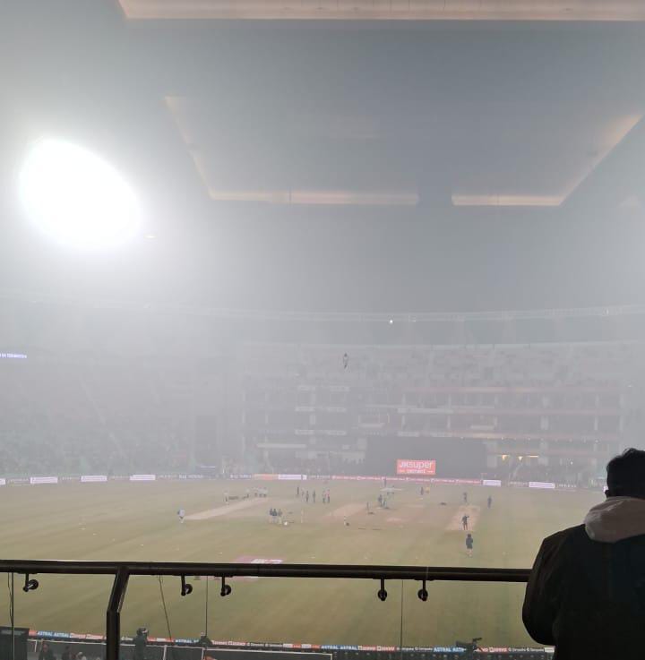 લખનઉમાં ઇકાના સ્ટેડિયમની આસપાસ ગોમતી નદીના કારણે ધુમ્મસ વધી ગયું છે. વિઝિબિલિટી પણ ઘણી ઓછી થઈ ગઈ છે. ફ્લડલાઇટ્સના પ્રકાશ પર પણ ધુમ્મસની અસર સ્પષ્ટ દેખાઈ રહી છે.