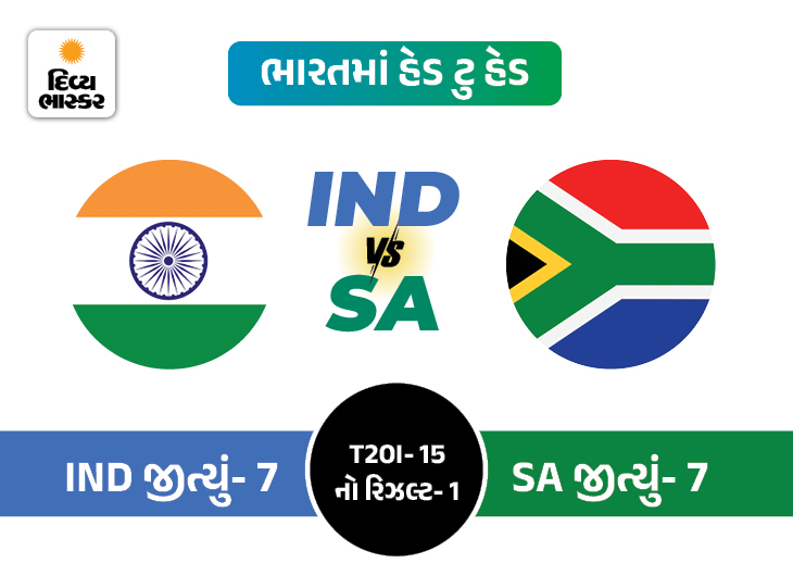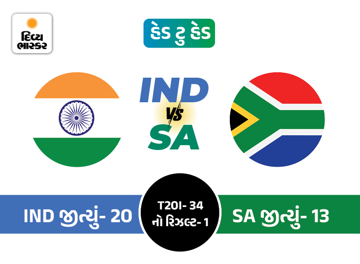 ભારત અને સાઉથ આફ્રિકા વચ્ચે અત્યાર સુધીમાં કુલ 34 T20 આંતરરાષ્ટ્રીય મેચ રમાઈ ચૂકી છે. જેમાંથી ટીમ ઈન્ડિયાએ 20 મેચમાં જીત મેળવી છે, જ્યારે સાઉથ આફ્રિકાને 13 મેચમાં સફળતા મળી છે. બંને ટીમ વચ્ચે એક મેચ અનિર્ણિત રહી છે.