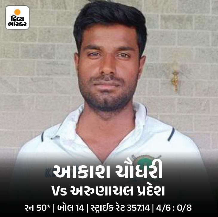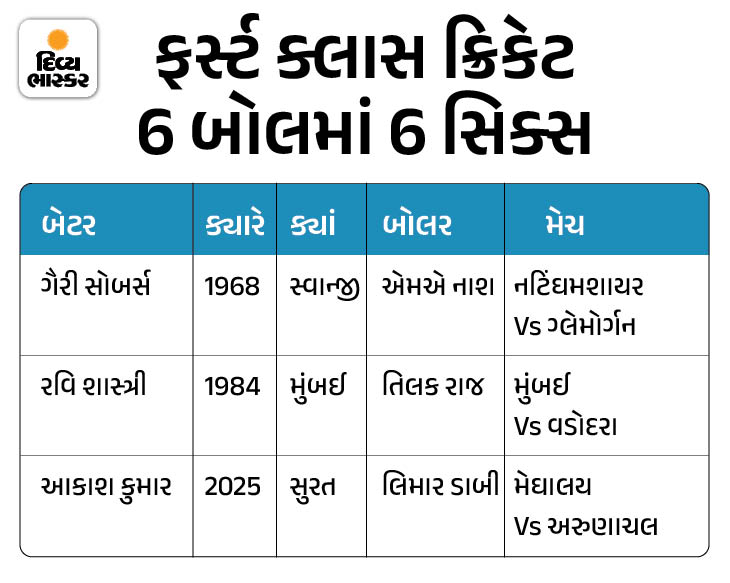 Akash Chaudhary hit 8 consecutive sixes in 8 balls. | 8 બોલમાં સતત 8 છગ્ગા ફટકાર્યા, VIDEO: સુરતમાં યુવરાજ-શાસ્ત્રીનો રેકોર્ડ તોડ્યો, 9 મિનિટ ને 11 બોલમાં ફાસ્ટેસ્ટ ફિફ્ટી; આકાશે રણજીમાં ઇતિહાસ રચ્યો