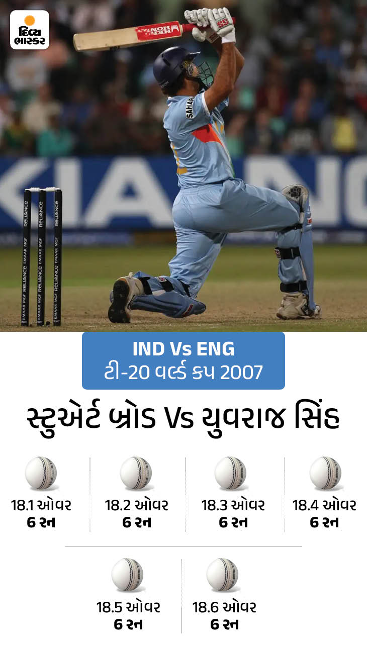સ્ટુઅર્ટ બ્રોડની ઓવરમાં યુવરાજ સિંહે 6 છગ્ગા ફટકાર્યા 2007ના ટી20 વર્લ્ડ કપમાં યુવરાજ સિંહે ઇંગ્લેન્ડ સામે છ છગ્ગા ફટકાર્યા હતા. તેણે એન્ડ્રુ ફ્લિન્ટોફ સાથેની દલીલ બાદ સ્ટુઅર્ટ બ્રોડના ઓવરના સતત છ બોલમાં છ છગ્ગા ફટકાર્યા હતા.