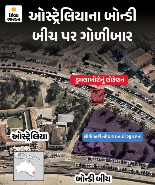 બોન્ડી બીચ પાસે બે આતંકવાદીઓએ એક બ્રિજ પરથી હનુક્કા તહેવાર મનાવી રહેલા લોકો પર આડેધડ ગોળીબાર કર્યો.