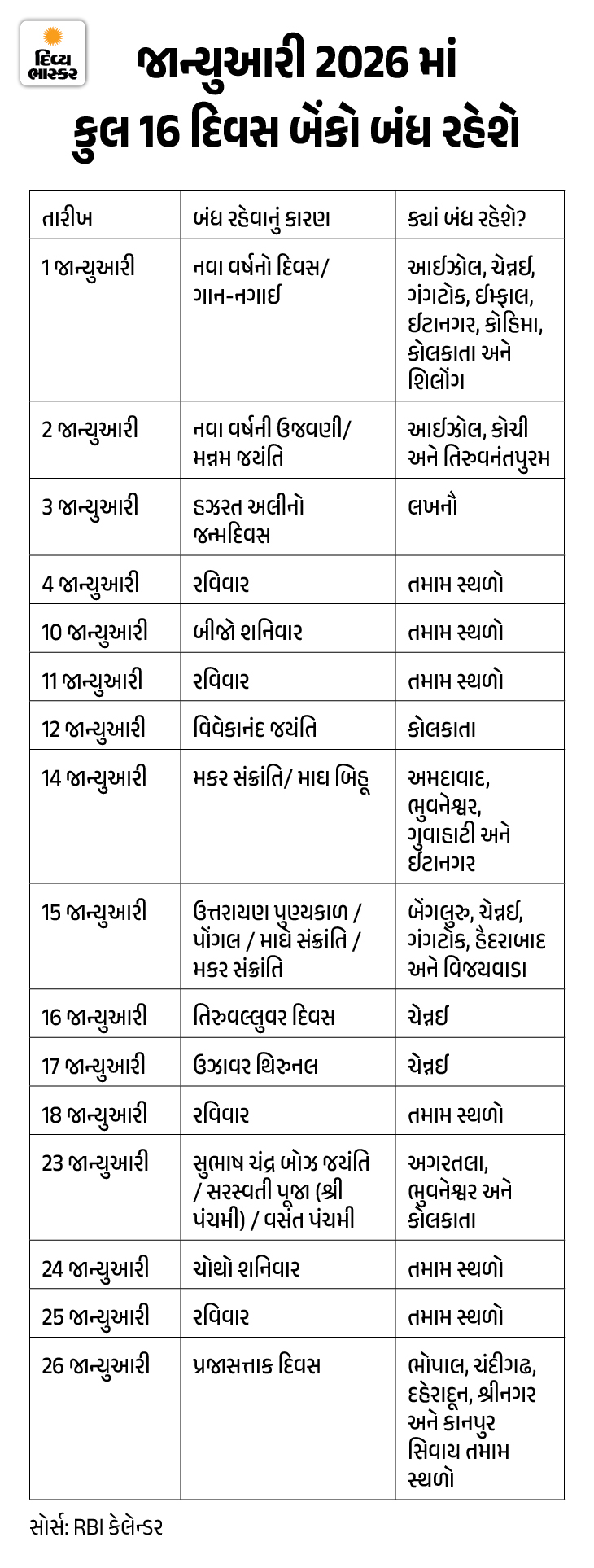 Bank Holidays January 2026 Update; Banks Closed 16 Days RBI Calendar | જાન્યુઆરી 2026માં 16 દિવસ બેંકો બંધ રહેશે: 4 રવિવાર, 2 શનિવાર અને ગણતંત્ર દિવસ ઉપરાંત 9 રજા; જુઓ RBIનું હોલિડે લિસ્ટ