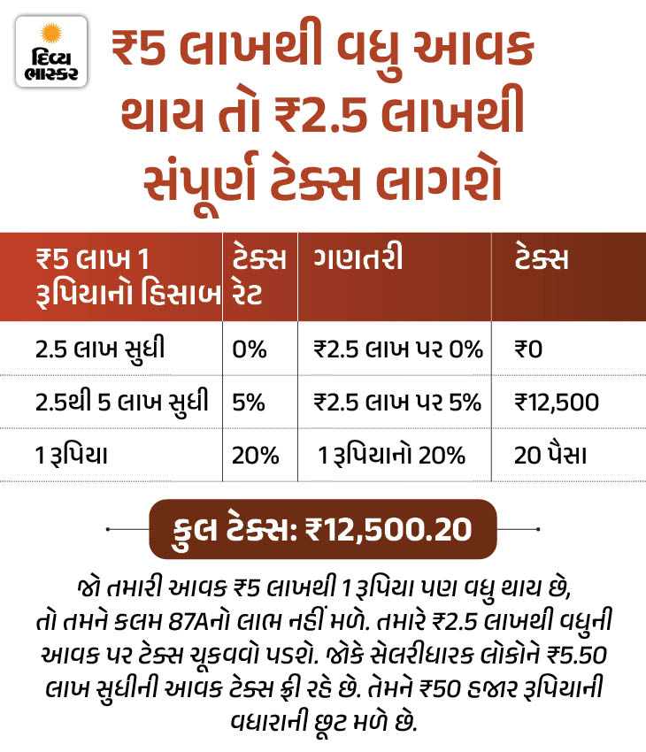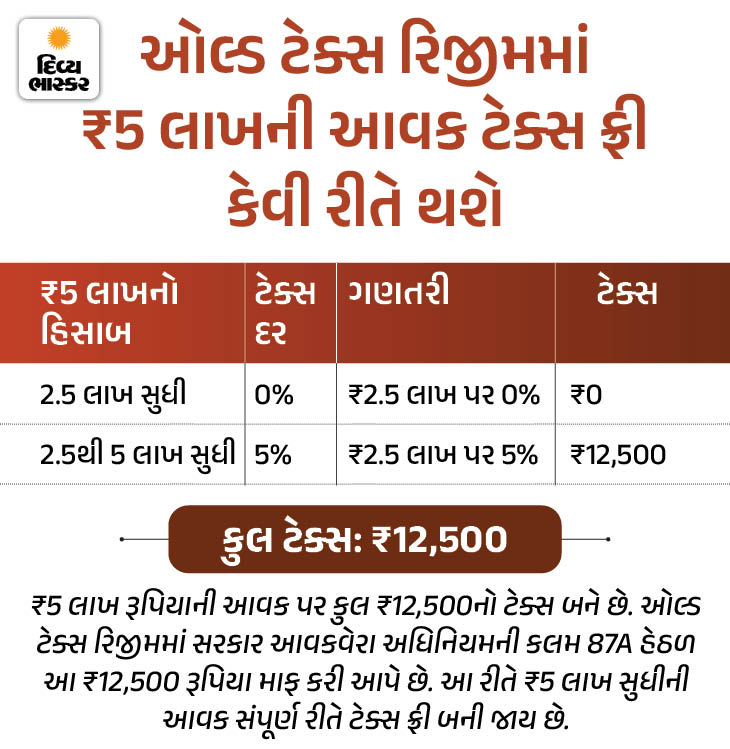 જૂની ટેક્સ રિજીમ પસંદ કરવા પર ₹2.5 લાખ સુધીની આવક જ ટેક્સ ફ્રી છે. જોકે ઇનકમ ટેક્સ એક્ટની કલમ 87A હેઠળ તમારે 5 લાખ સુધીની આવક પર ઝીરો ટેક્સ આપવો પડશે.