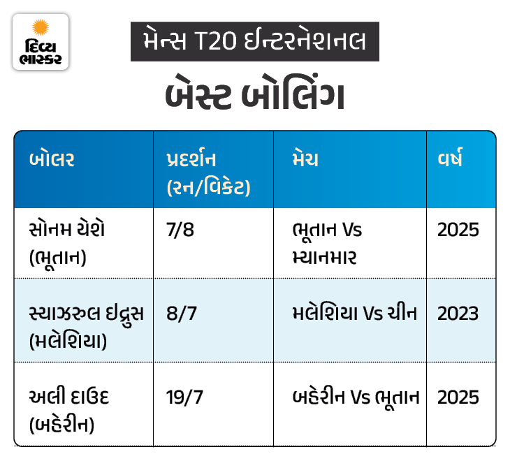 - બહેરીનના અલી દાઉદે 2025માં ભૂતાન સામે 19 રન આપીને 7 વિકેટ લીધી હતી.