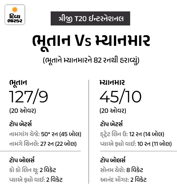 ભૂતાને મ્યાનમારને 82 રનથી હરાવ્યું સોનમ યેશેની શાનદાર બોલિંગને કારણે ભૂતાને મ્યાનમારને 128 રનના લક્ષ્યનો પીછો કરતા માત્ર 45 રનમાં ઓલઆઉટ કરી દીધું. ભૂતાને આ મેચ 82 રનથી જીતી લીધી. પાંચ મેચની T20 સિરીઝમાં ભૂતાન હાલમાં 4-0થી આગળ છે. આ સિરીઝમાં સોનમ યેશે અત્યાર સુધી 4 મેચમાં 12 વિકેટ લઈ ચૂક્યો છે. સિરીઝની છેલ્લી મેચ સોમવારે રમાશે.