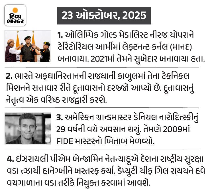 6. સ્પોર્ટ્સઃ ઓલિમ્પિક ગોલ્ડ મેડલ વિજેતા નીરજ ચોપરા લેફ્ટનન્ટ કર્નલ બન્યા:સંરક્ષણ મંત્રી રાજનાથ સિંહે આ પદવી એનાયત કરી, સેના પ્રમુખ પણ હાજર રહ્યા (સંપૂર્ણ સમાચાર વાંચો)