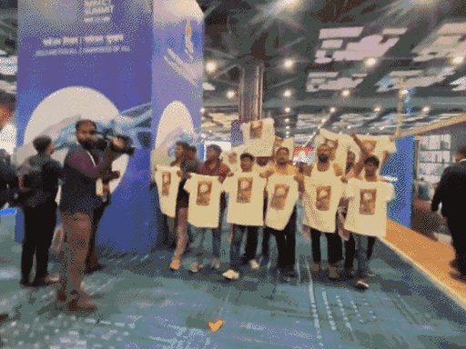 દિલ્હી ખાતે ભારત મંડપમમાં ઇન્ડિયન યુથ કોંગ્રેસના કાર્યકર્તાઓએ શુક્રવારે AI સમિટ 2026માં ભારત-અમેરિકા ટ્રેડ ડીલ સામે વિરોધ પ્રદર્શન કર્યું. કાર્યકર્તાઓએ ટી-શર્ટ કાઢીને વડાપ્રધાન નરેન્દ્ર મોદી વિરુદ્ધ નારા લગાવ્યા હતા.