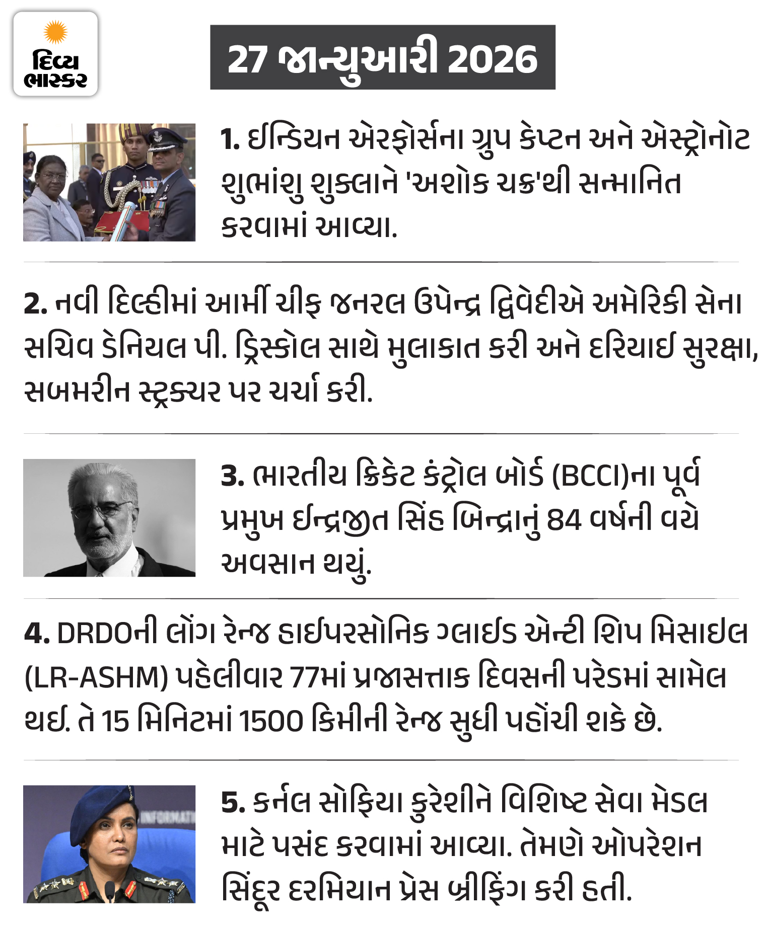 1.નેશનલ : દિલ્હીની પરેડમાં બાજ, ઊંટનું આકર્ષણ:ગુજરાતના ટેબ્લોએ રંગ રાખ્યો; યુરોપીયન કાઉન્સિલના અધ્યક્ષ પરેડ જોઈને દંગ રહી ગયા, જુઓ PHOTOS વાંચો સંપૂર્ણ સમાચાર
