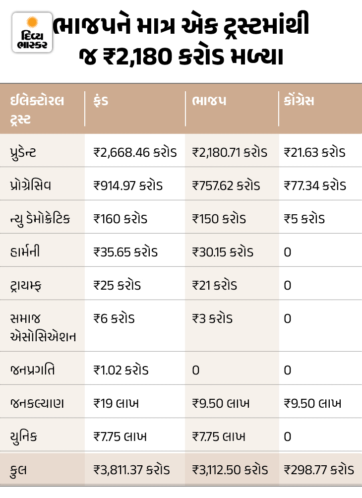 ભાજપને દાન આપવાના મામલે પ્રુડેન્ટ ઇલેક્ટોરલ ટ્રસ્ટ સૌથી આગળ રહ્યું. ભાજપને કુલ ₹3,112 કરોડમાંથી ₹2,180.07 કરોડ એકલા પ્રુડેન્ટે આપ્યા. પ્રુડેન્ટે કોંગ્રેસને ₹21.63 કરોડનું દાન આપ્યું.
