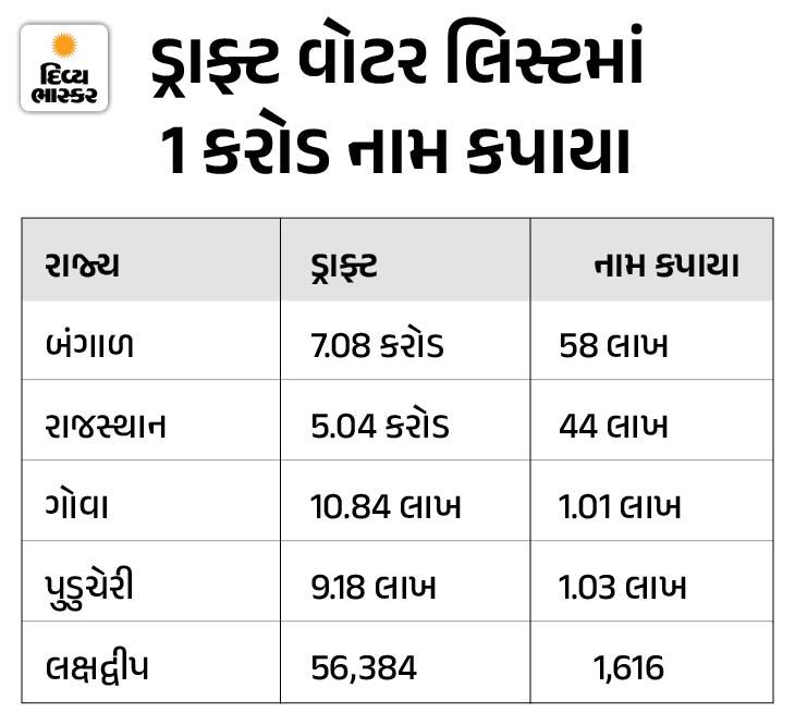 • ગોવા- 11.85 લાખ મતદારોમાંથી 10.84 લાખે ફોર્મ જમા કરાવ્યા. અહીં 1 લાખથી વધુ નામ હટાવવામાં આવ્યા, જેમાં મૃત, ગેરહાજર, કાયમી ધોરણે સ્થળાંતરિત અને ડુપ્લિકેટ મતદારોનો સમાવેશ થાય છે. ઉત્તર ગોવામાં 44,639 અને દક્ષિણ ગોવામાં 55,403 નામ હટાવવામાં આવ્યા.