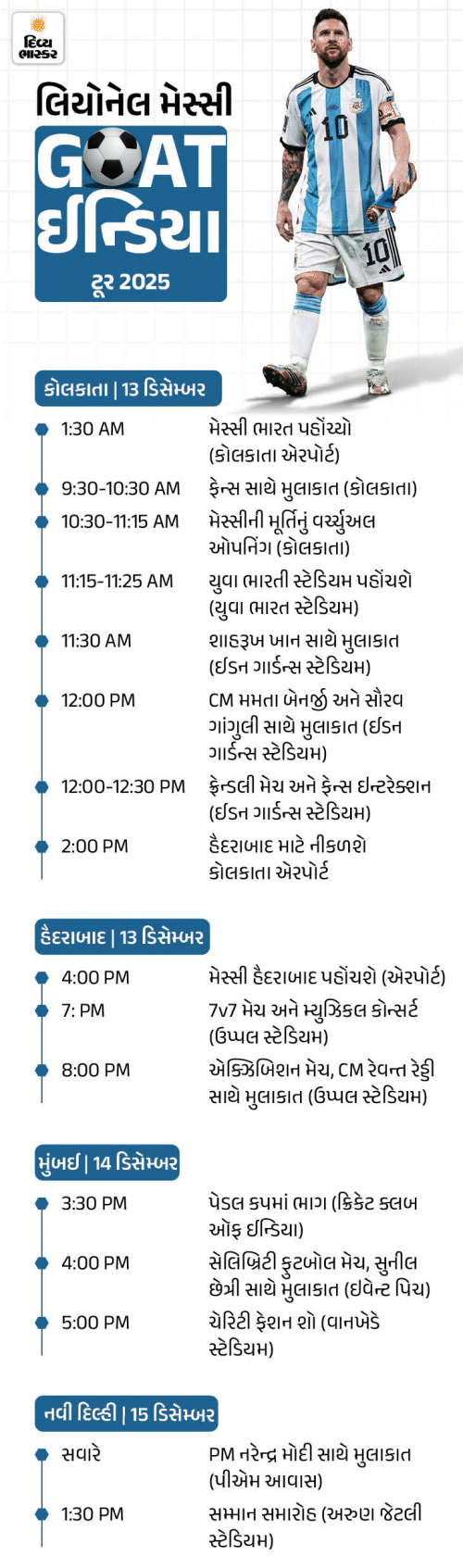 મેસ્સી યુનાઈટેડ નેશન્સના ચાઈલ્ડ ઓર્ગેનાઈઝેશન UNICEFના બ્રાન્ડ એમ્બેસેડર છે, જે અંતર્ગત તે ભારતમાં ‘GOAT ઇન્ડિયા’ ટૂર કરી રહ્યો છે. મેસ્સીને 4 શહેરોની મુલાકાત લેવાની છે. જેમાં હૈદરાબાદ, મુંબઈ અને નવી દિલ્હીનો પણ સમાવેશ થાય છે. 15 ડિસેમ્બરે વડાપ્રધાન નરેન્દ્ર મોદી સાથે મુલાકાત સાથે તેમનો પ્રવાસ સમાપ્ત થશે.