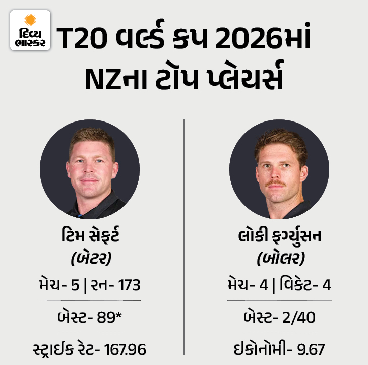લોકી ફર્ગ્યુસન ન્યૂઝીલેન્ડનો ટૉપ વિકેટ ટેકર ન્યૂઝીલેન્ડ માટે ટિમ સેફર્ટે આ ટુર્નામેન્ટમાં સૌથી વધુ રન બનાવ્યા છે. તેણે 4 મેચમાં 167.96ની સ્ટ્રાઈક રેટથી 173 રન બનાવ્યા. તેનો શ્રેષ્ઠ સ્કોર 89* રહ્યો. જ્યારે, લોકી ફર્ગ્યુસન ન્યૂઝીલેન્ડ માટે ટૉપ વિકેટ ટેકર રહ્યા છે. તેણે 4 મેચમાં માત્ર 9.67ની ઇકોનોમીથી 4 વિકેટ લીધી છે.