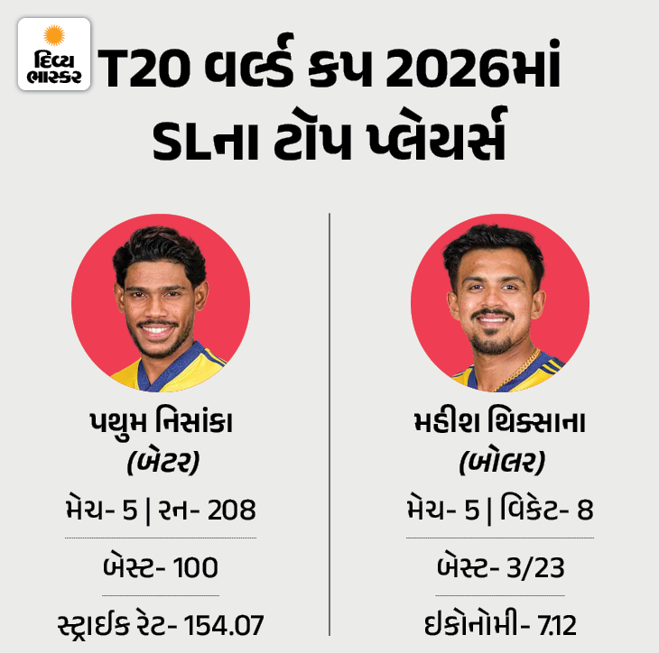 પથુમ નિસાંકા શ્રીલંકાનો ટૉપ બેટર પથુમ નિસાંકાએ ટુર્નામેન્ટમાં શ્રીલંકા માટે સૌથી વધુ રન બનાવ્યા છે. તેણે 5 મેચમાં 154.07ના સ્ટ્રાઈક રેટથી 208 રન બનાવ્યા. એક ઇનિંગ્સમાં તેનો સર્વશ્રેષ્ઠ સ્કોર 100* રન રહ્યો છે. જ્યારે, બોલિંગમાં મહીશ થીક્સાના ટીમ માટે ટૉપ વિકેટ ટેકર રહ્યો છે. તેણે 5 મેચમાં 7.12ની ઇકોનોમીથી રન ખર્ચ કરીને 8 વિકેટ લીધી.