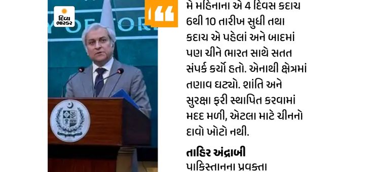 પાકિસ્તાને ચીનના ‘ઓપરેશન સિંદૂર’ દરમિયાન મધ્યસ્થીના દાવાને સમર્થન આપ્યું છે. ચીનના દાવા સંબંધિત પ્રશ્નના જવાબમાં પાકિસ્તાનના વિદેશ મંત્રાલયના પ્રવક્તા તાહિર અંદ્રાબીએ ગુરુવારે પ્રેસ બ્રીફિંગમાં જણાવ્યું હતું કે ચીનના નેતાઓ તે દિવસોમાં પાકિસ્તાની નેતૃત્વ સાથે સતત સંપર્કમાં હતા. ચીનના નેતાઓએ ભારતીય નેતૃત્વ સાથે પણ કેટલીક વાતચીત કરી હતી.