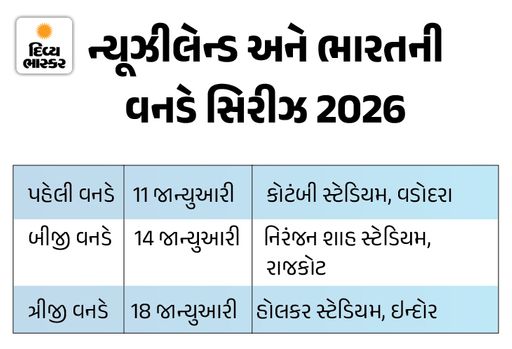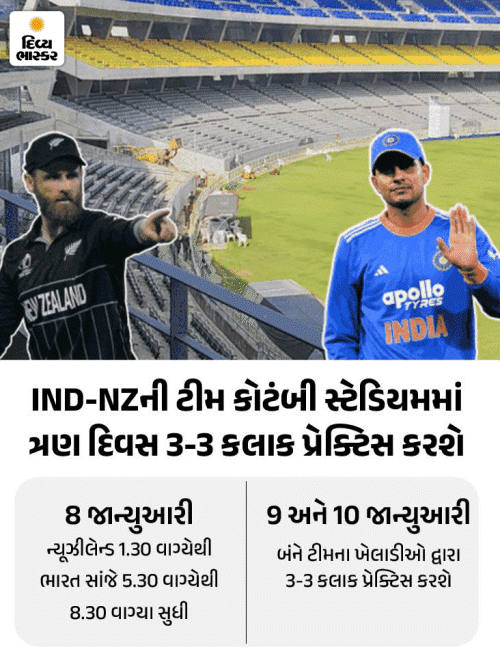 ભારત-ન્યૂઝીલેન્ડના ખેલાડીઓ કોટંબીમાં 3 દિવસ પ્રેક્ટિસ કરશે વડોદરાના કોટંબી ઇન્ટરનેશનલ ક્રિકેટ સ્ટેડિયમમાં 8 જાન્યુઆરીએ ન્યૂઝીલેન્ડ બપોરે 1.30થી પ્રેક્ટિસ કરશે, જ્યારે ભારત સાંજે 5.30 વાગ્યાથી 8.30 વાગ્યા સુધી પ્રેક્ટિસ કરશે. 9 અને 10 જાન્યુઆરીએ પણ બંને ટીમના ખેલાડીઓ 3-3 કલાક સુધી પ્રેક્ટિસ કરશે.