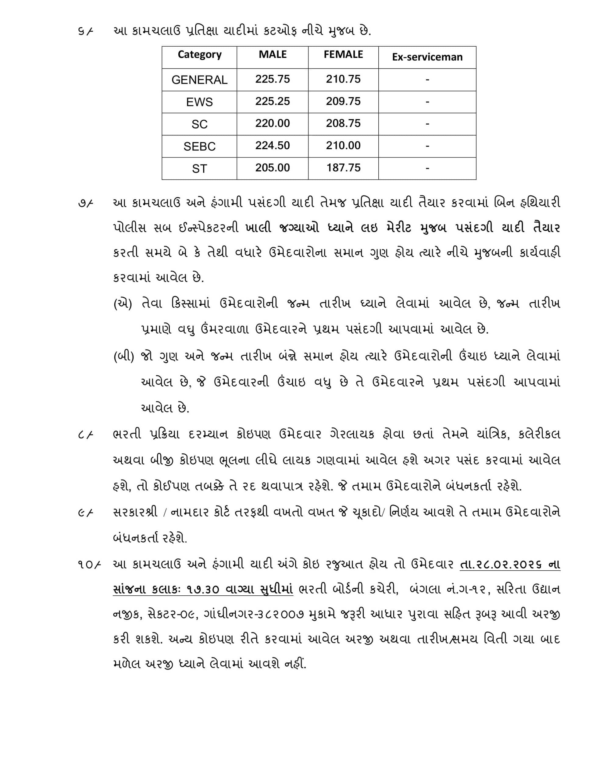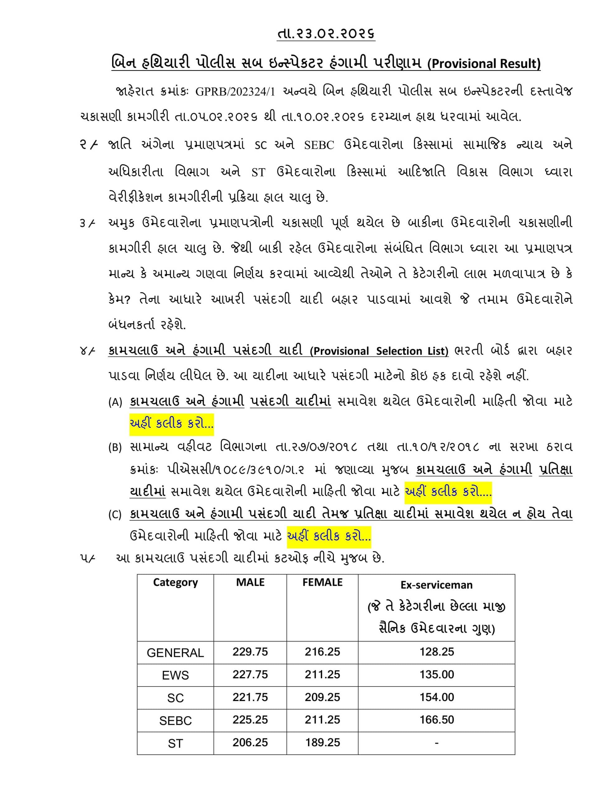 પરીક્ષા નિયમો મુજબ, કુલ 1023 ઉમેદવારોના દસ્તાવેજોની ચકાસણી 5 ફેબ્રુઆરી, 2026થી 10 ફેબ્રુઆરી, 2026 દરમિયાન પૂર્ણ કરવામાં આવી હતી. આ પ્રક્રિયા પછી, 472 ઉમેદવારોની હંગામી પસંદગી યાદી (Provisional Selection List) તથા 95 ઉમેદવારોની હંગામી પ્રતીક્ષા યાદી (Provisional Waiting List) જાહેર કરવામાં આવી છે. આ યાદી ગુજરાત પોલીસ ભરતી બોર્ડની સત્તાવાર વેબસાઇટ પર ઉપલબ્ધ છે.