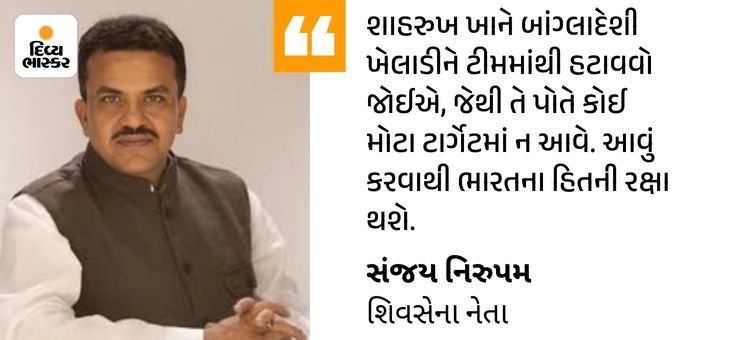 શિવસેનાનેતા સંજય નિરુપમે KKRના માલિક શાહરુખ ખાનને બાંગ્લાદેશી ક્રિકેટર મુસ્તફિઝુર રહેમાનને ટીમમાંથી હટાવવા અપીલ કરી છે. નિરુપમે કહ્યું- ‘જ્યારે આખો દેશ બાંગ્લાદેશને લઈને ગુસ્સા અને નારાજગીમાં છે. અમે તેમને વિનંતી કરીએ છીએ કે તેઓ તે બાંગ્લાદેશી ખેલાડીને ટીમમાંથી હટાવી દે.’ તો બીજી તરફ, શિવસેના (યુબીટી)ના પ્રવક્તા આનંદ દુબેએ કહ્યું- બાંગ્લાદેશી ખેલાડીઓને IPLમાં ભારતીય ધરતી પર રમવાની મંજૂરી ન આપવી જોઈએ.