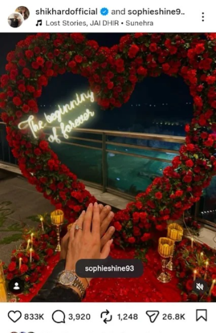 ધવને 12 જાન્યુઆરીએ ઇન્સ્ટાગ્રામ પર લખ્યું હતું- સ્મિતથી લઈને સપના સુધી, બધું જ શેર કરતા. અમારી સગાઈ માટે મળેલા પ્રેમ, આશીર્વાદ અને શુભેચ્છાઓ માટે આભારી છું. અમે હંમેશા માટે એકબીજાનો સાથ પસંદ કરી રહ્યા છીએ. આ પહેલા IPLમાં શિખર પંજાબ કિંગ્સ માટે રમતો હતો ત્યારે પણ સોફી ટીમને સપોર્ટ કરતી જોવા મળી હતી.