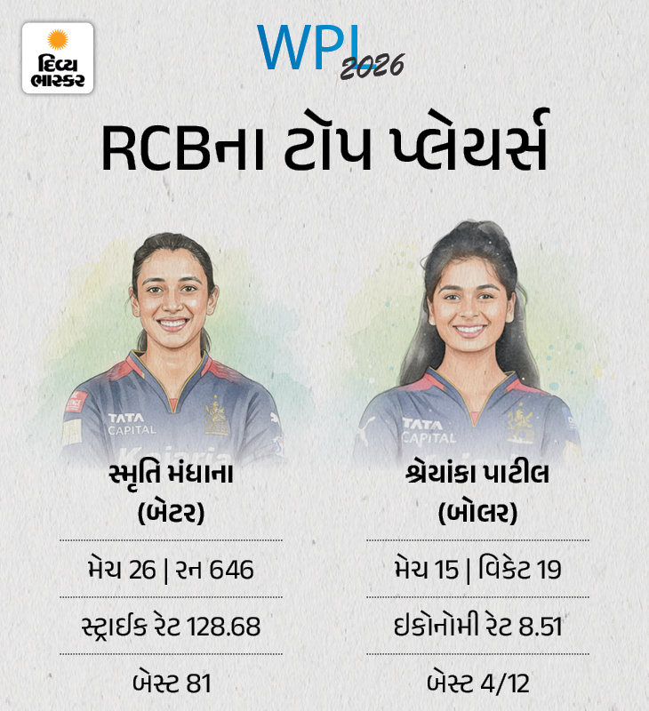 બેંગલુરુ તરફથી સૌથી વધુ રન કેપ્ટન સ્મૃતિ મંધાનાએ બનાવ્યા છે. તેના નામે 26 મેચમાં 646 રન છે. મંધાના 128.68ના સ્ટ્રાઈક રેટથી રન બનાવે છે. જ્યારે, શ્રેયંકા પાટીલે RCB તરફથી સૌથી વધુ વિકેટ લીધી છે.