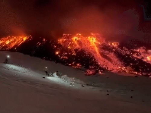 taly Mount Etna Volcano Eruption; Lava Flows Through Snow VIDEOS | બરફની ચાદર પર આગની નદી: કુદરતના કરિશ્માનો અચરજ પમાડતો VIDEO, બરફના પહાડ વચ્ચેથી નીકળતો લાવા; માઉન્ટ એટનામાં પાણીની જેમ વહ્યા અંગારા