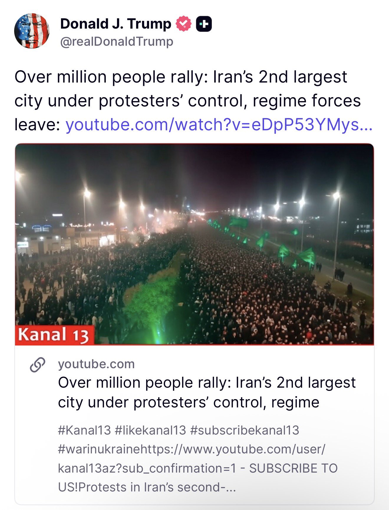 અમેરિકાના રાષ્ટ્રપતિ ટ્રમ્પે દાવો કર્યો છે કે ઈરાનના બીજા સૌથી મોટા શહેર મશહદ પર હવે પ્રદર્શનકારીઓનો કબજો થઈ ગયો છે.