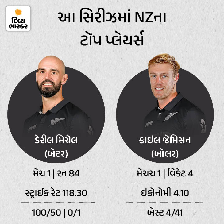 જેમીસને પાછલી મેચમાં 4 વિકેટ લીધી ડેરીલ મિચેલે આ સિરીઝની પ્રથમ મેચમાં ન્યૂઝીલેન્ડ માટે સૌથી વધુ 84 રન બનાવ્યા હતા, જોકે તે ટીમને જીત અપાવવામાં સફળ રહ્યો નહોતો. તે જ સમયે, કાઇલ જેમીસને બોલિંગમાં 4 વિકેટ લીધી હતી. જેમીસન સિરીઝનો ટૉપ વિકેટ ટેકર છે.