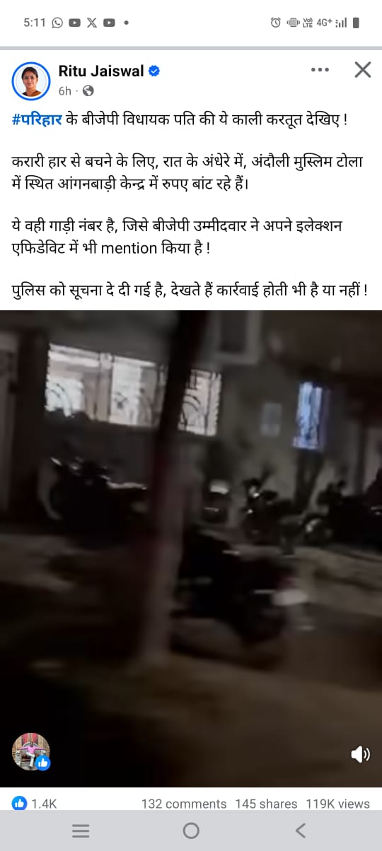 પરિહાર બેઠક પરથી અપક્ષ ઉમેદવાર તરીકે ચૂંટણી લડી રહેલા રીતુ જયસ્વાલની ફેસબુક પોસ્ટ