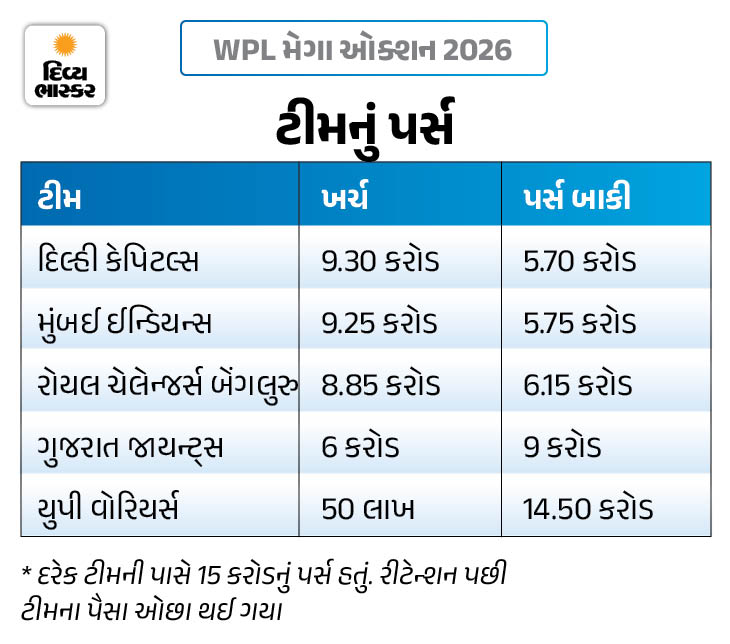 મુંબઈ ઈન્ડિયન્સ (MI), રોયલ ચેલેન્જર્સ બેંગલુરુ (RCB), દિલ્હી કેપિટલ્સ (DC), યુપી વોરિયર્સ (UPW) અને ગુજરાત જાયન્ટ્સ (GG) 5 ટીમ છે. બધી ટીમ પાસે 15 કરોડ રૂપિયાનું પર્સ હતું, પરંતુ રિટેન્શન પછી દરેક ટીમના પર્સમાં અલગ-અલગ રકમ બચી. યુપી પાસે સૌથી વધુ 14.50 કરોડ રૂપિયાનું પર્સ છે. ગુજરાત પાસે 9 કરોડ રૂપિયા છે. જ્યારે MI, DC અને RCBનું પર્સ 6.50 કરોડ રૂપિયાથી ઓછું છે.