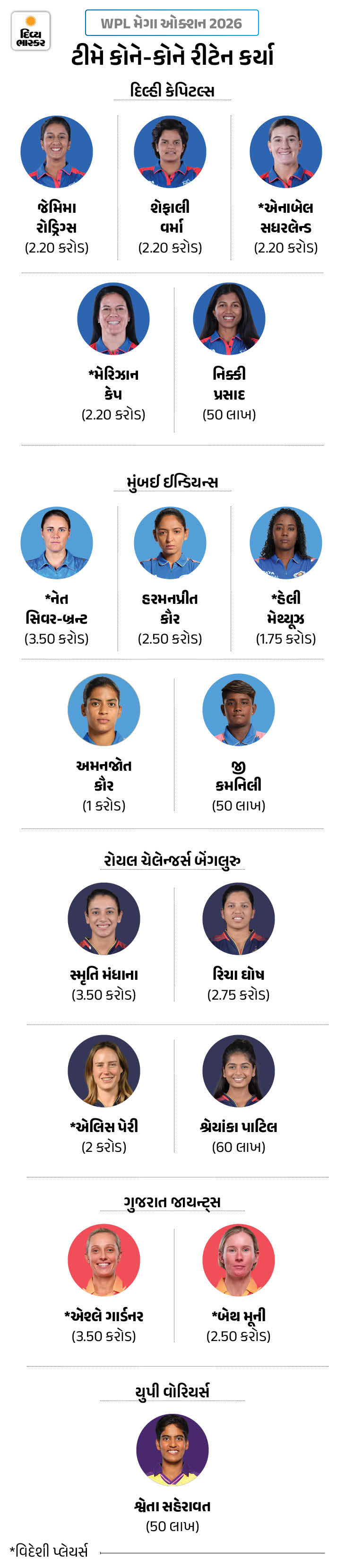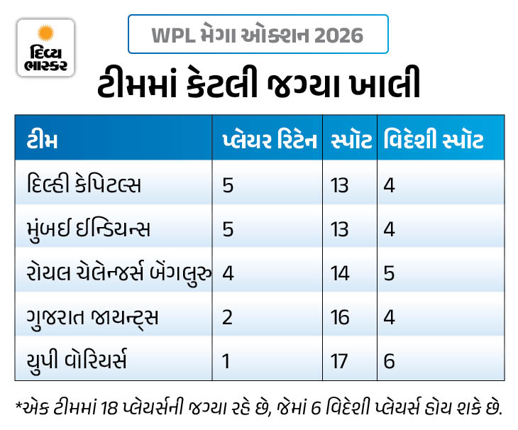 MI અને DCએ 5-5 ખેલાડીઓને રિટેન કર્યા. RCB એ 4 અને ગુજરાતે 2 ખેલાડીઓને રાખ્યા. જ્યારે UPએ માત્ર 1 અનકેપ્ડ ખેલાડીને રિટેન કર્યો. એક ટીમમાં 15 થી 18 ખેલાડીઓ હોઈ શકે છે, જેમાં વધુમાં વધુ 6 વિદેશી ખેલાડીઓ હોઈ શકે છે. આ હિસાબે ટીમમાં 73 ખેલાડીઓની જગ્યા ખાલી છે.